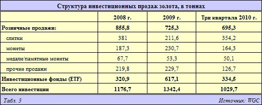 Прочие инвестиционные продажи – это в основном активность западных покупателей. В 2009–2010 гг. около 40% этого количества составляли продажи в Европе, причем европейцы предпочитают либо небольшие слитки, либо монеты. Активно шла торговля схожим товаром и в Америке – USGS в 2009 г. отмечала даже локальный дефицит мелких (менее унции) монет и слитков.