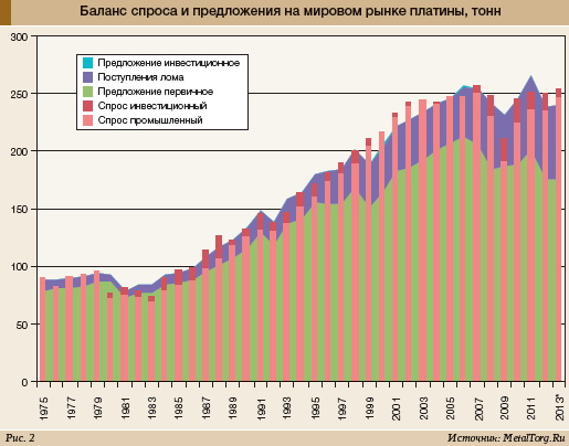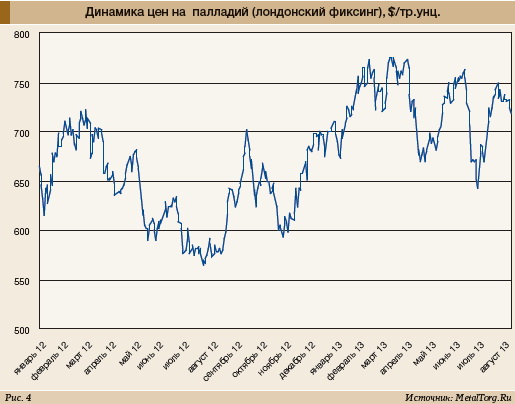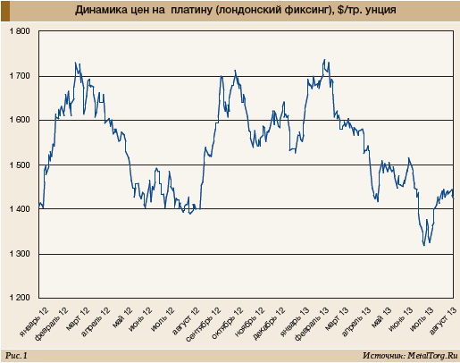 Заметный обвал производства, запасов и поставок платиноидов в 2012–2013 гг. чуть поднял цены палладия, но «не произвел» никакого впечатления на рынок платины. В июне 2013 г. цены последней вновь опускались ниже двухлетнего минимума.
