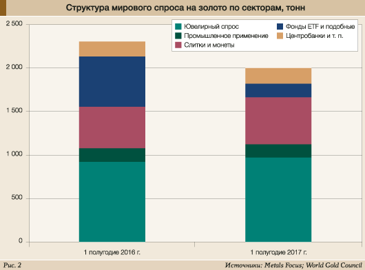 Снижение этого показателя WGC в первую очередь связывает с некоторым падением спроса на обеспеченные золотом торгуемые на биржах фонды (ETF) в первой половине 2017 года, хотя в аналогичном периоде 2016 года этот спрос, наоборот, резко увеличивался (рис. 2).