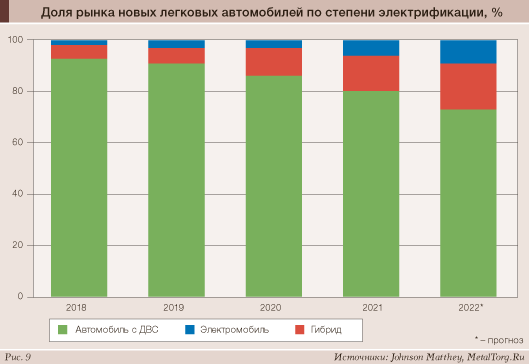 На фоне дефицита микросхем и ужесточения стандартов по выбросам процесс перехода автопрома с бензиновых и дизельных двигателей на электромобили заметно ускорился. Доля рынка аккумуляторных электромобилей (BEV) утроилась за последние два года до 6%. В то же время многие автомобильные компании считают, что из-за дороговизны этот тип автомобилей неконкурентоспособен и массовый переход на электромобили к 2040 году достаточно сложен.