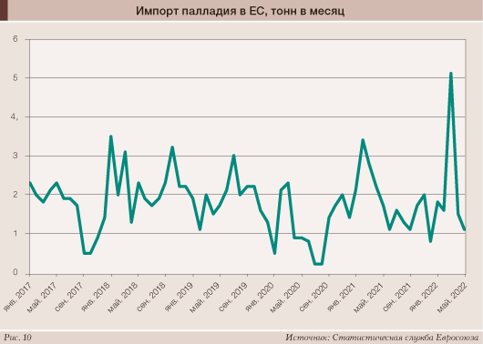 Как бы ни хотелось, но классической западной автопромышленности – на двигателях внутреннего сгорания – оказалось практически нечем заменить российский палладий. После запрета грузового авиасообщения с РФ его начали перевозить в ЕС в грузовых отсеках пассажирских самолетов. В марте Европейский союз провел закупку рекордной партии палладия – 5,1 т. Эти значения можно назвать абсолютным рекордом за 20 лет (рис. 10).