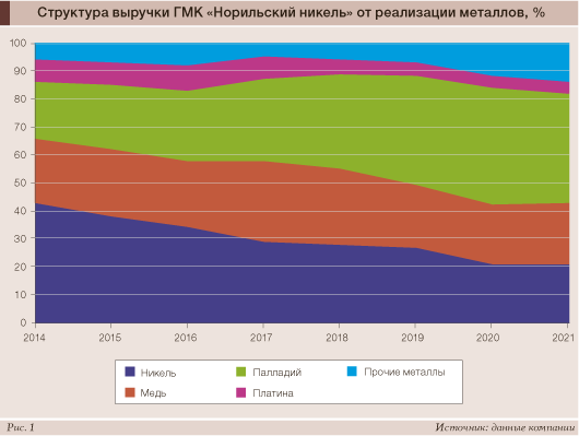 В прошлом году российская компания столкнулась с рядом непредвиденных обстоятельств. Из-за аварии пришлось временно останавливать Норильскую обогатительную фабрику, а из-за подтопления грунтовыми водами – добычу на основных рудниках, «Октябрьском» и «Таймырском» (к настоящему моменту рудники и фабрика восстановлены и работают на полную мощность). Это привело к снижению производства палладия и платины в 2021 году до 81,4 т (-7%) и 19,9 т (-8%) соответственно. Однако благодаря росту биржевых цен на металлы и увеличению объемов продаж палладия из накопленных ранее запасов общая выручка «Норникеля» в 2021 году выросла на 15% и составила $17,9 млрд, а выручка от реализации платиноидов увеличилась на 10%, до $8,406 млрд. Начиная с 2018 года палладий стал важнейшим для компании товаром с точки зрения доходов, принося около 40% всей выручки (рис. 1).