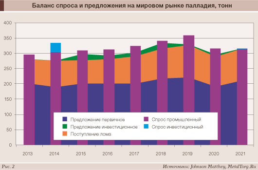 В отличие от предложения, мировой спрос на палладий не смог восстановиться за этот период до уровня 2019 года. Высокие цены повлияли на промышленное потребление, вынудив некоторых автопроизводителей вспомнить про альтернативу этому металлу – платину. Но в целом рынок палладия в 2021 году оказался достаточно сбалансирован (рис. 2).