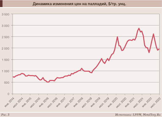Однако параллельно в мировой индустрии продолжал нарастать дефицит полупроводников, в результате чего расширение автомобильного производства затормозилось, а вскоре сменилось ощутимым падением. По данным LMC Automotive, некоторое восстановление отрасли началось только в июне 2022 года. Однако в целом по итогам шести месяцев продажи легковых и легких коммерческих автомобилей показывали сокращение на 8,5% по сравнению с аналогичным периодом прошлого года. В результате снижения закупок палладия автопроизводителями и дополнительных поставок из Южной Африки напряженность на этом рынке ослабла. К концу года цена опустилась до $1800 за унцию.