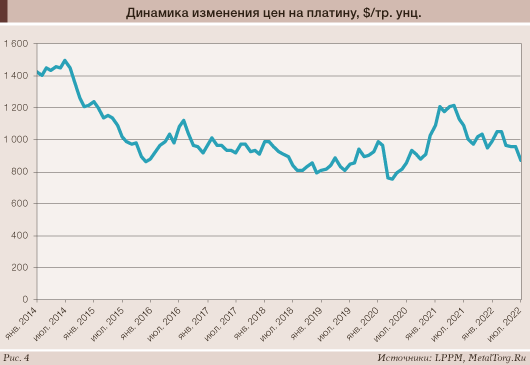 Динамика мировых цен на платину в меньшей степени зависела от ситуации в мировой экономике. Длительное время цена на металл держалась в диапазоне $800–1000 за унцию. В начале 2021 года на фоне ожиданий восстановления автомобильного рынка и многообещающих перспектив роста водородной экономики стоимость платины достигла 6-летнего максимума, превысив отметку $1300 за унцию. Однако она вскоре вновь скорректировалась вниз, вернувшись к диапазону $900–1100 за унцию (рис. 4).