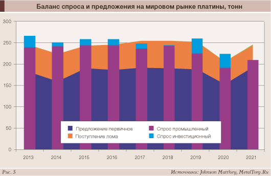 Инвестиции (слитки, монеты, ETF и запасы на бирже) – хоть и незначительная, но наиболее переменчивая часть спроса на платину. При привлекательных ценах инвесторы скупают металл, и спрос достигает рекордных значений – так было в 2019 и 2020 годах. К концу 2020 года запасы инвесторов были на исторически высоком уровне: почти 4 млн унций платины хранились в биржевых фондах (ETF) по всему миру. Когда в середине февраля 2021 года платина поднялась до шестилетнего максимума цен, некоторые инвесторы воспользовались возможностью зафиксировать прибыль. В течение первой половины 2021 года продажи были особенно заметны на японском рынке, где поведение инвесторов очень чувствительно к краткосрочным колебаниям цен на металлы.