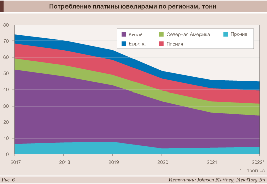 В 2021 году мировой спрос на платину в ювелирной промышленности впервые за 30 лет снизился до 46 т. В первую очередь такое падение было обусловлено сокращением продаж в Китае на четверть. В III квартале 2020 года резкий рост цен на золото побудил розничных продавцов Поднебесной выделить больше места на прилавках для платиновых украшений. Однако реакция потребителей на это оказалась достаточно сдержанной, что привело к формированию избытка данного товара у торговцев. По прогнозам Johnson Matthey, спрос на ювелирные изделия из платины в 2022 году будет по-прежнему слабым и останется на том же уровне (рис. 6).