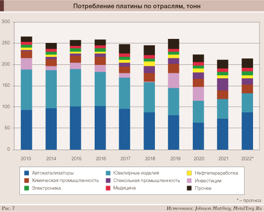 Доля платины, использующейся в производстве автокатализаторов, увеличилась в 2021 году с 28 до 35%, а в 2022 году, по прогнозам Johnson Matthey, может вырасти до 41% (рис. 7).