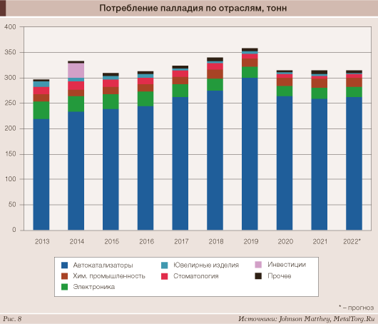 Но, как сообщил в одном из интервью Forbes вице-президент ГМК «Норникель» Антон Берлин: «Заместить весь палладий невозможно». Хотя его доля в автомобильной промышленности, занимающая обычно 85% от общего спроса, все же сократилась на 3% в 2021 году. По прогнозам Johnson Matthey, в текущем году она останется на том же уровне (рис. 8).