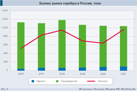 Импорт аффинированного серебра в Россию осуществляется в незначительных количествах, однако в 2021 году он вырос на 15%, до 97,6 т. Основными странами – экспортерами серебра в РФ стали Италия (36,6 т; +39%), Корея (15,1 т; +25%) и Япония (14,3 т; 13%). В сумме эти три страны составляют около 80% всех поставок в нашу страну.
