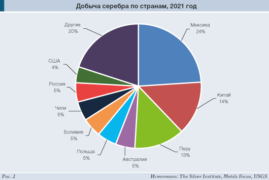 Тем не менее средняя стоимость серебра в 2021 году на мировом рынке составила $25 за унцию, что на 22% выше, чем в 2020 году (рис. 1).