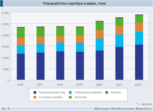 Нельзя не отметить, что новых рекордных уровней достиг в 2021 году мировой объем переработки серебряного лома и отходов – 173 млн унций (+7%). В основном это было обусловлено наличием накопленного во время пандемии промышленного лома (крупнейший источник вторичного серебра). Также более высокие цены на серебро подтолкнули потребителей к посещению ломбардов и продаже им своих серебряных изделий (рис. 3).