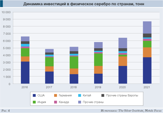 После спада в 2020 году мировой спрос на серебро взлетел на рекордные 19%, до 1,05 млрд унций, превысив допандемийные объемы и достигнув самого высокого уровня с 2015 года, говорится в отчете отраслевой организации The Silver Institute. В 2021 году все категории спроса продемонстрировали подъем, при этом физические инвестиции показали наибольший рост – на 36%, до 278,7 млн унций (8668 т). К слову, интерес инвесторов к серебру повышается уже четвертый год кряду. США и Германия стали крупнейшими странами – потребителями соответствующей продукции благодаря повышению инвестиционной привлекательности серебра на фоне экономической нестабильности, роста инфляции и недоверия властям (рис. 4).