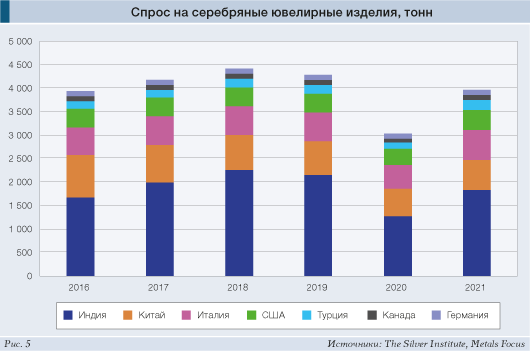 Большая часть прироста является результатом активности крупнейших производителей Индии. После ослабления карантина в стране сразу увеличилось число свадеб и других торжественных мероприятий, на которых востребованы украшения и расшитые драгоценными металлами ткани. Также рост отмечается в Италии (+26%), США (+15%) и Китае (+10%). В США наблюдался бум продаж из-за того, что многие потребители решили вместо запланированных туристических поездок перенаправить свои накопления в серебро. Ювелирное производство в Китае выросло в связи с восстановлением после пандемии 2020 года, а также с замедлением процесса перехода от простых, но увесистых изделий к более легким дизайнерским (см. рис. 5).