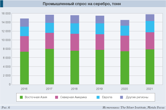 Традиционно около 50% от всего мирового потребления серебра приходится на промышленность. Несмотря на то что в 2021 году еще не все логистические цепочки были восстановлены, спрос вырос на 9%, до 508,2 млн унций (15,8 тыс. т), говорится в отчете The Silver Institute. Растущее внимание к экологически чистым катализаторам и электромобилям, для производства которых требуется серебро, поспособствовало увеличению спроса на металл.