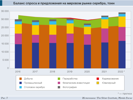 Таким образом, несмотря на то что добыча на шахтах восстановилась до уровня, близкого к 2019 году, а переработка увеличилась до восьмилетнего максимума, спрос на серебро со стороны основных потребителей был настолько высоким, что избежать возникновения дефицита в 2021 году не удалось (рис. 7).