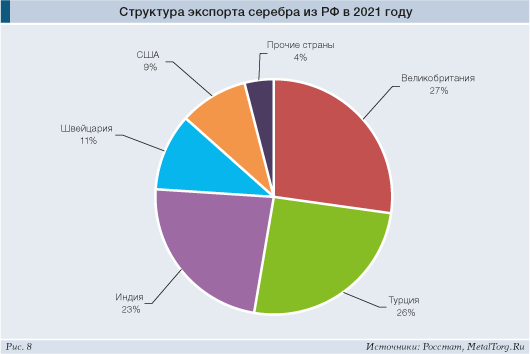 По данным Росстата, в 2021 году вывоз российского серебра был увеличен в следующие страны: Турцию (с 24,5 до 245,8 т), США (с 201 кг до 90,5 т), Индию (225,7 т; +33%), Швейцарию (102,4 т; +32%). А вот Великобритания, наоборот, сократила объемы импорта российского серебра на 23%, до 263 т (рис. 8).