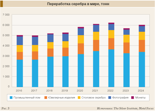 Отметим, что новых рекордных уровней в 2024 году достиг мировой объем вторичной переработки серебра, составивший 193,9 млн унций (6032 т). Наибольший прирост в натуральном выражении пришелся на промышленные источники (+5%; 109,9 млн унций, или 3419 т).