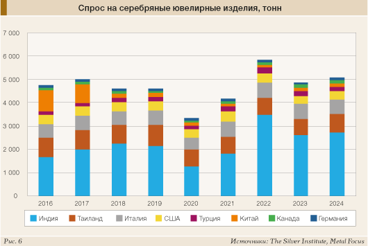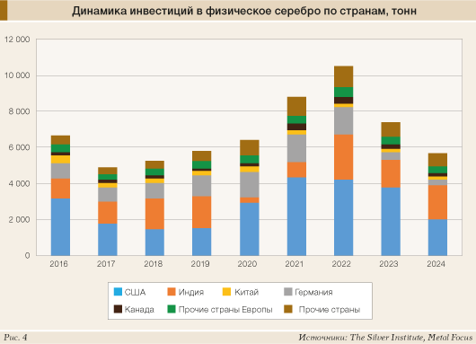 Наибольший спад интереса наблюдался в «богатых странах», например в США, где покупки монет и слитков оказались на самом низком уровне с 2019 года (-46%). Потери также были и на некоторых ключевых западных рынках, таких как, например, Германия (-26%), где последствия повышения НДС на некоторые изделия из серебра в 2023 году продолжали оказывать давление на спрос. Индия была единственным крупным рынком, где в прошлом году наблюдался рост инвестиций в физическое серебро (+21%) благодаря оптимистичным ценовым ожиданиям и снижению импортной пошлины (рис. 4).