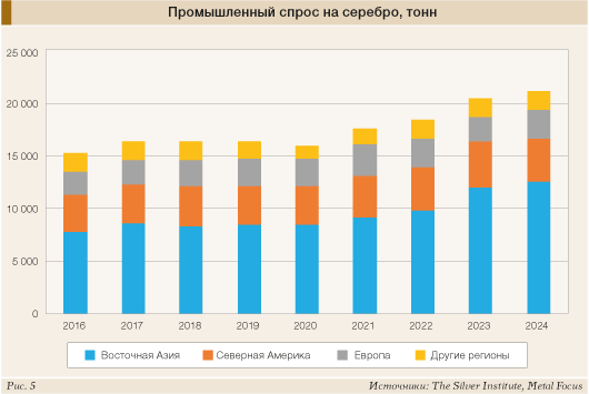 Общий показатель роста промышленного спроса в странах ЕС на 18% мог показаться стремительным. Однако он произошел на фоне очень слабого 2023 года, когда наблюдалось снижение активности в таких секторах, как электроника и производство солнечных панелей. По сравнению же с 2022 годом потребление выросло всего лишь на 1%, до 88 млн унций (2738 т). Основными сдерживающими рост причинами стали относительно слабое состояние местной экономики, в частности Германии (крупнейшего потребителя промышленного серебра в Европе), а также инвестиционные «опасения его перспектив» (рис. 5).