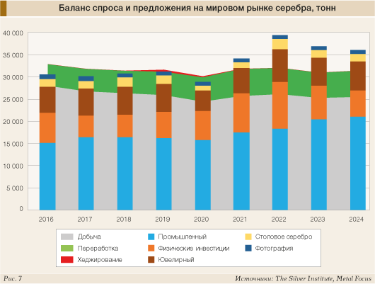 Другими факторами, заметно повлиявшими в 2024 году на рынок серебра, являются традиционные баланс спроса и предложения (производства), а также динамика его промышленного применения.