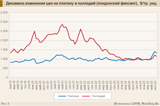 На фоне стремительного роста цен на золото и серебро рынок двух основных металлов платиновой группы (МПГ) – платины и палладия – на протяжении всего 2024 года выглядел довольно спокойно. Динамика цен в целом была сдержанной, но все же отрицательной относительно предыдущего года. Сказалось сокращение заказов со стороны автомобильной промышленности. Палладий подешевел за прошлый год на 27%, до средних $984 за унцию, платина – на 1%, до $956 за унцию (рис. 1).