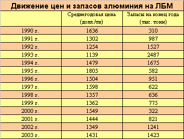 Таким образом, в целом в 2003 г. и в начале 2004 г. рынок цветных металлов был на подъеме, причем рост котировок наблюдался как для металлов, находящихся в дефиците (медь и никель), так и для алюминия. В конце апреля 2004 г. произошел существенный спад в ценах на все металлы, независимо от степени насыщенности рынка. В 2003 г. такие важные факторы, как величина складских запасов и баланс (избыток) алюминия на рынке, в отличие от предыдущих лет не играли определяющую роль в ценообразовании алюминия. К моменту начала снижения цен на ЛБМ в конце апреля - начале мая 2004 г. произошло существенное снижение складских запасов, которые к концу мая составили 1,06 млн. тонн.