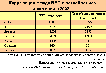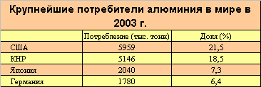 Среди основных причин роста цен на алюминий и другие цветные металлы в 2003 - 2004 гг. в первую очередь называют бурный рост экономики КНР. В 2003 г. и на страну приходилось 20% мирового потребления алюминия, 23% - меди, 27% - стали. В 1998 г. КНР опередила Японию по потреблению алюминия и с тех пор занимает второе место в мире (после США). КНР является не только крупнейшим потребителем, но и производителем алюминия в мире. Темпы роста производства алюминия в стране существенно превосходят среднемировые. За 2003 г. его производство возросло более чем на 25%, что обусловлено ростом внутреннего потребления металла. Если в 1992 г. производство алюминия в КНР находилось на уровне 1,1 млн. тонн, то в 2003 г. этот показатель увеличился в 5 раз и достиг 5,5 млн. тонн. В стране практически за десятилетие созданы крупнейшие в мире мощности по производству алюминия.
