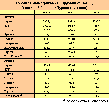 Как отмечает "Metal Bulletin Research" ("MBR"), во II квартале 2004 г. европейские продуценты стальных труб столкнулись с проблемой дефицита горячекатаной рулонной стали. Цены на трубы для строительства в ЕС колебались в пределах 520 - 580 евро/тн в зависимости от цен на рулонную сталь. Так, в южных странах Евросоюза - в Италии и Испании - продуцентам труб используемая ими импортная рулонная сталь обходилась дороже (по 450 евро/тн франко-завод), чем потребителям в северных государствах ЕС (по 420 евро/тн). Отмечают, что итальянским фирмам удавалось продавать такие трубы по цене, превышающей 600 евро/тн, но только при поставке небольшими партиями. Высокий уровень цен на итальянском рынке привлекал поставщиков труб из Великобритании и Скандинавских стран.