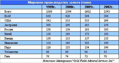 Россия экспортирует до 85% добываемого золота. За счет этого в 2002 г. государственная казна получила около 1,2 млрд. долл. Указом президента РФ с января 2002 г. золотодобывающим компаниям России было разрешено экспортировать слитки золота. Это способствовало росту экспорта российского золота, который, по сообщению руководителя российских золотопромышленников В. Брайко, в 2002 г. составил около 125 тонн (в 2001 г. - 110 тонн). Кроме того, расширению экспорта способствовал рост мировых цен на золото, а также отмена с 1 января 2002 г. 5%-ной вывозной таможенной пошлины.