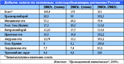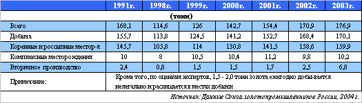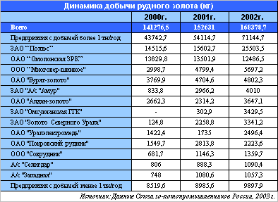 В последние годы добыча рудного золота росла быстрыми темпами. По данным Союза старателей России, доля добычи золота из коренных месторождений по отношению общей добыче, включая извлечение попутного золота, составила (%): 1998 г. - 33, 2000 г. - 37, 2001 г. - 41,4, 2002 г. - 48,1 Практически весь прирост добычи за 2000-2003 гг. был обеспечен за счет разработки коренных месторождений.
