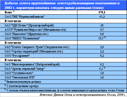 В 2003 г. примерно 44,5% всей российской добычи золота приходилось на 6 крупнейших золотодобывающих компаний, в том числе на. ОАО ГМК "Норильский никель" -24,2%, ОАО "МНПО "Полиметалл" - 6,3%, ООО "Руссдрагмет" - 3,7, ЗАО "Артель старателей "Амур" -3,6%, ОАО "Сусуманзолото" - 3,5%, ОАО "Омолонская ЗРК" - 3,3%.