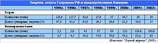 Начиная с 1999 г. правительство России фактически прекратило финансирование добычи золота и стало приобретать его только для Гохрана и Центрального банка место государства заняли коммерческие банки, доля которых в общих закупках металла стала увеличиваться быстрыми темпами.