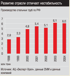 Вспомним 2003 год: он был для трубной отрасли достаточно успешным - объем производства вырос на 18,2% и достиг 6,1 млн тонн. Стоимость труб, по данным Фонда развития трубной промышленности, за 2002 - 2003 годы увеличилась в 1,2 - 1,35 раза. Причины - сверхприбыли основного потребителя труб нефтяной промышленности.