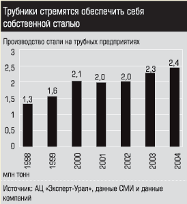 2005 год не принесет улучшения российской трубной промышленности. Рост цен на сталь прогнозируется небольшой, но они и без того высоки. Сами трубники или только планируют расширение сталелитейных мощностей, или начали инвестирование. Поэтому какое-то время они будут зависеть от цен, диктуемых металлургами. Меньше всего пострадают те, кто по максимуму закрывает потребности в стали собственным производством.