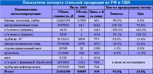 По данным опубликованной таможенной статистики США после июньского «взлета» экспорт российской стальной продукции в эту страну резко упал. За июль 2005 ввоз российского металлопроката снизился на 75% до 49476,99 тонн по сравнению с показателем прошлого месяца. Это также в 3,9 раза меньше показателя июля 2004 года.
