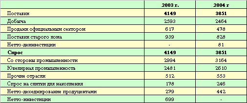 В 2004 г. отмечалось сокращение как мирового спроса на золото, так и его поставок, что видно из приведенных ниже данных GFMS (тонн):