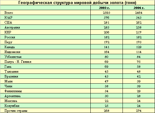 Суммарные поставки золота на мировой рынок снизились в 2004 г. на 7%. В прошлом году отмечались наиболее высокие темпы снижения мировой золотодобычи за период с 1943 г. (на 5%, или на 128 т, по сравнению с 2003 г. - до 2464 т). Это было обусловлено, в частности, такими факторами, как закрытие ряда рудников, неблагоприятные погодные условия и замедление темпов производства металла. Особенно значительно добыча золота в 2004 г. сократилась в Индонезии, ЮАР и Австралии (в сумме на 100 т), что частично компенсировалось ростом добычи в некоторых странах, в первую очередь в КНР.