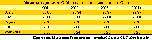 Мировое производство редкоземельных металлов (РЗМ) приближается к 100 тыс. тонн в год, здесь и далее - в пересчете на оксиды редкоземельных металлов (РЗО). Доминирующим продуцентом является КНР. Кроме того, РЗМ добываются в Индии, России, Казахстане, Киргизии и Малайзии Переработка концентратов и выпуск частично обработанных или промежуточных продуктов осуществляется в ряде европейских стран, в США, Японии и КНР.