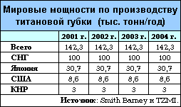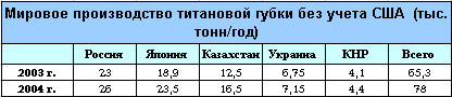 По оценке Геологической службы США, в 2004 г. мировое производство титановой губки (без учета США, где информация о нем не публикуется) выросло по сравнению с 2003 г. на 19% и характеризовалось следующими данными (тыс. тонн):