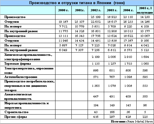 Японская фирма Sumitomo Titanium Corp. в 2004 г. вернулась к полномасштабному производству в 18 тыс. тонн/год, возобновив эксплуатацию ряда ранее остановленных печей. Toho Titanium в апреле 2005 г. расширила свои мощности по выпуску титановой губки до 14 тыс. тонн/год, а в ноябре планировала довести их до 15 - 16 тыс.