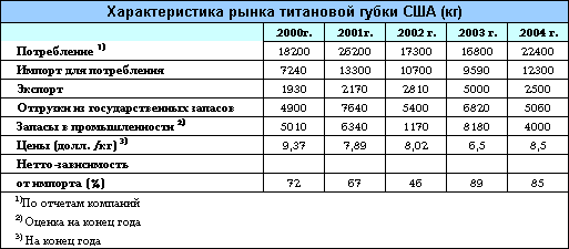 По оценке, потребление титановой губки в США выросло в 2004 г. на 33%. Примерно 60% всего металлического титана в стране было использовано в аэрокосмической промышленности. В стоимостном выражении потребление титановой губки в США в 2004 г. оценивается в 190 млн. долл. (исходя из средней цены в 8,5 долл./кг).