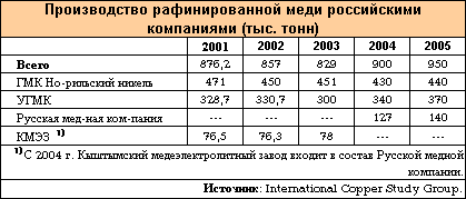 Общее производство рафинированной меди в России в 2006 г., по прогнозам специалистов, может достигнуть 1 млн. т. Согласно данным World Metal Statistics, потребление меди в стране выросло с 422,4 тыс. т в 2003 г. до 557,5 тыс.т в 2004 г.