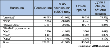 2 апреля компания "АСМ-холдинг" систематизировала итоги работы российских заводов в первые два месяца 2003 года. Выяснилось, что предприятия снизили производство на 22.3% по сравнению с аналогичным периодом прошлого года (произведено 153 110 автомобилей против 19 743 в январе-феврале прошлого года). При этом выпуск легковых машин в январе-феврале 2003 года составил 115 349 против 160 465 автомобилей за первые два месяца прошлого года. В принципе падение производства было ожидаемым - в январе практически все заводы устроили себе "рождественские каникулы" и практически не работали. Остановку конвейеров руководство заводов аргументировало падением спроса на автомобили. Однако, как выяснилось, падение спроса на иномарках существенно не сказалось. За первые три месяца собираемые в России и на постсоветском пространстве иномарки "средней ценовой категории", а особенно корейские модели, побили все рекорды продаж в России.