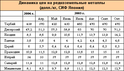С января по октябрь 2005 г. цены на неодим поднялись на 67% - с 8,5 цо 14,2 долл./кг, на диспрозий, тербий и празеодим - соответственно на 39, 24 и 30%.