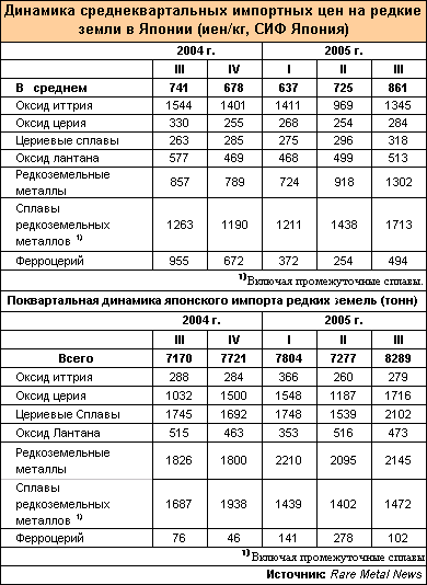 В последнее время выросли также японские средние импортные цены на неодим и диспрозий, используемые в производстве редкоземельных магнитных сплавов, и на мишметалл для водород-аккумулирующих сплавов. Средняя импортная цена на редкоземельные металлы в Японии в июле - сентябре 2005 г. повысилась по сравнению с теми же месяцами 2004 г. на 52% - с 857 до 1302 иен/кг. Ввоз редкоземельных металлов в Японию в июле - сентябре 2005 г. увеличился по сравнению с тем же периодом 2004 г. на 18% -до 2145 тонн.