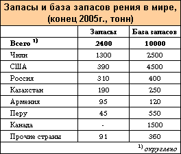 Повышение мировой добычи рения в 2005 г. было обусловлено, в первую очередь, трехкратным ростом его производства в Казахстане, которому способствовало образование республиканской государственной компании Zhezkazganredmet под патронажем Министерства промышленности и торговли страны. Значительное увеличение добычи рения наблюдалось также в США (на 17%), что было вызвано ростом попутного производства молибденовых концентратов на меднопорфировых месторождениях страны. Выпуск молибдена на пяти действующих медно-молибденовых рудниках США в прошлом году вплотную приблизился к уровню проектных мощностей предприятий. Кроме того, добыча рения в 2005 г. повысилась и в Чили (на 4%).