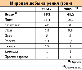 По оценке, мировая добыча рения в 2005 г. выросла по сравнению с 2004 г. на 17,7% - до 43,2 тонн; ее географическая структура была следующей: