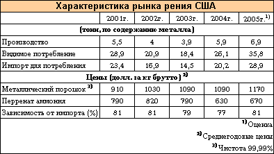 В 2005 г. средняя цена на металлический рений составила около 1170 долл./кг, что на 7% выше, чем в 2004 г. Импорт рения в США вырос в прошлом году примерно на 43% ввиду повышения спроса со стороны продуцентов специальных сплавов и катализаторов. Потребление рения в США в 2005 г. оценивается в 32 млн. долл.