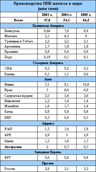 Крупнейшими регионами по выпуску ППВ железа в 2005 г. являлись Азия (свыше 25 млн. тонн) и Латинская Америка (более 19 млн. тонн). Первое место в мире по их производству в 2005 г. занимала Индия, далее следовали Венесуэла, Иран и Мексика. Значительными мощностями располагают страны Ближнего и Среднего Востока, а также Северной Африки, Азии. В условиях роста цен на железосодержащее сырье заводы по выпуску ППВ железа в 2005 г. работали с максимальной загрузкой мощностей.